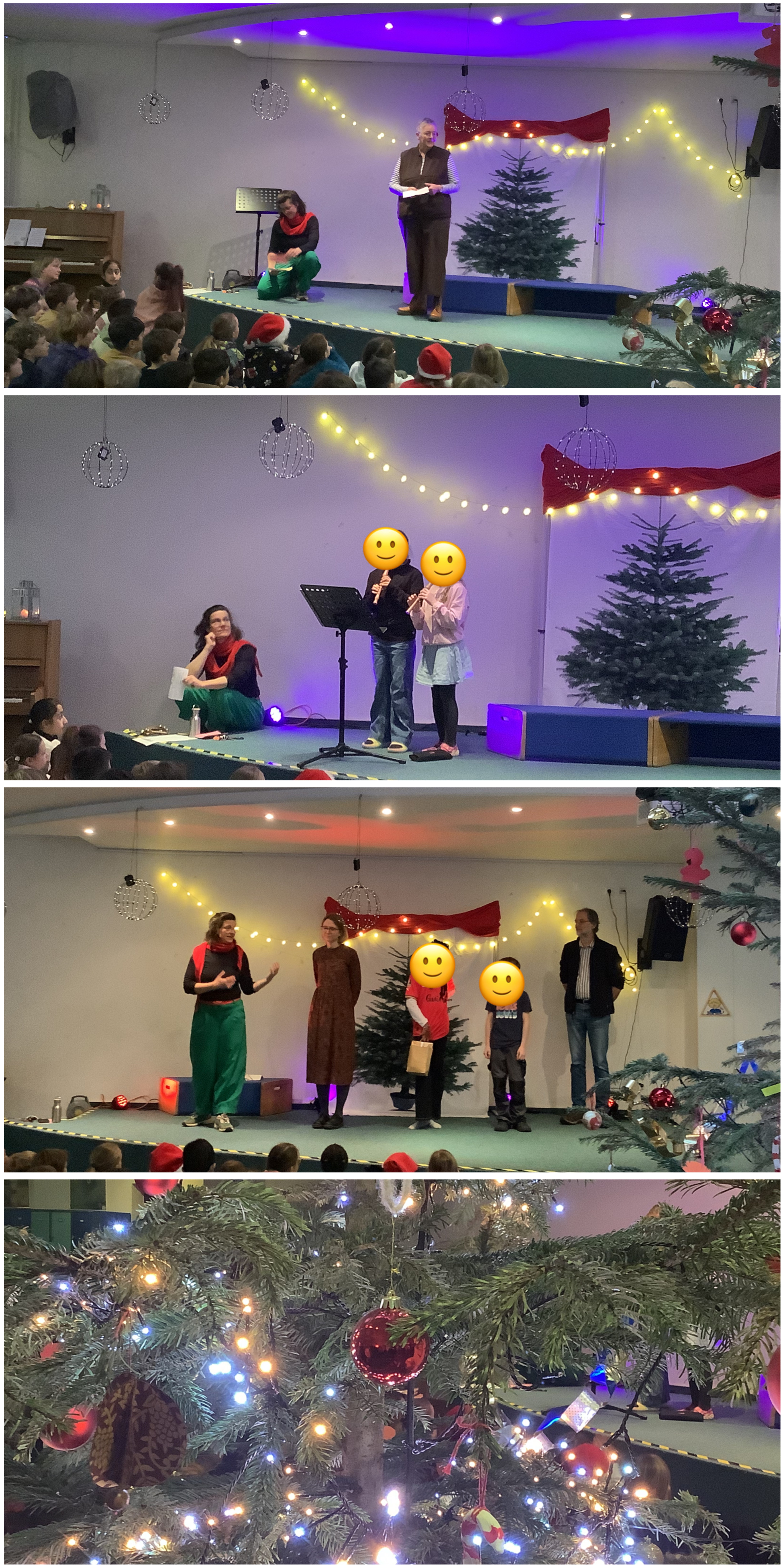 Kinder verschiedener Klassen führten kleine Theaterstücke auf, musizierten oder trugen Gedichte vor. Jede Vorstellung wurde mit donnerndem Applaus belohnt, denn die Schülerinnen und Schüler zeigten allesamt tolle Leistungen. Zum Abschluss kamen auch alle Lehrerinnen und Lehrer auf die Bühne, um vor begeisterten Eltern und Schülern ein Weihnachtslied zu singen.