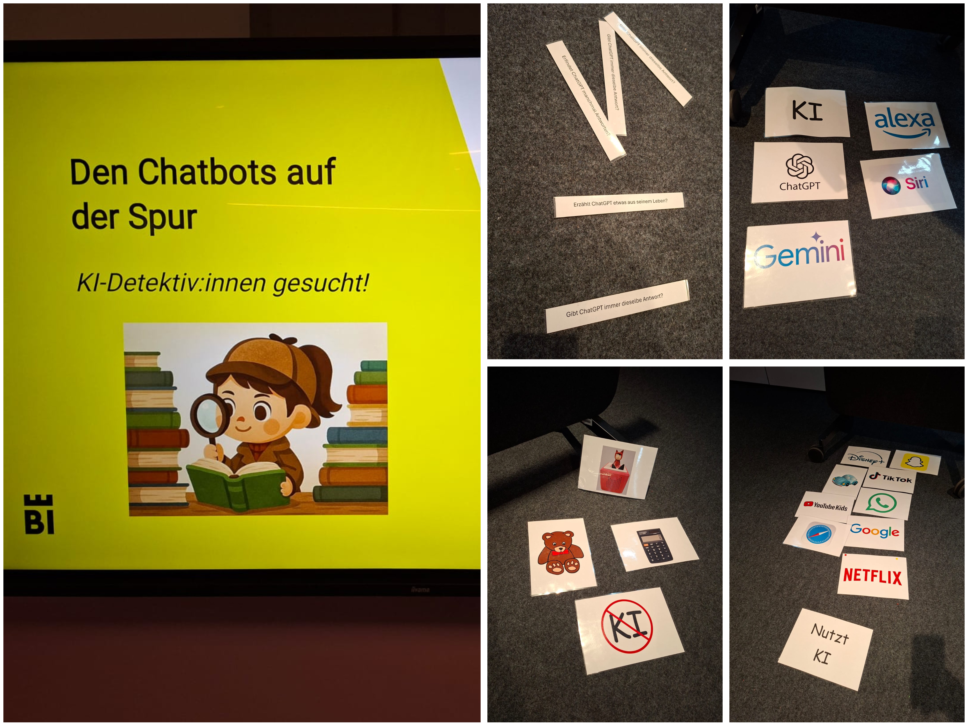 Dieses Jahr waren wir zum ersten Mal in der erst 2024 neu eröffneten Bielefelder Wissenswerkstatt zu Besuch. Die Kinder besuchten einen Workshop zum Thema "Training im KI-Gym". Hier ging es um die spannende Frage "Wo steckt überall KI drin und weiß sie wirklich alles?". Spielerisch und experimentell lernten die Kinder dieser Frage nachzugehen. An verschiedenen Stationen konnten sie ausprobieren was KI alles kann. Sie mussten erkennen ob ein Foto echt ist oder KI generiert. Es wurde am PC gezeichnet und die KI erkannte, was man darstellen wollte. Außerdem wurde mit KI eine Geschichte geschrieben. Dazu gabe es spannende Diskussionsfragen (siehe Foto).
