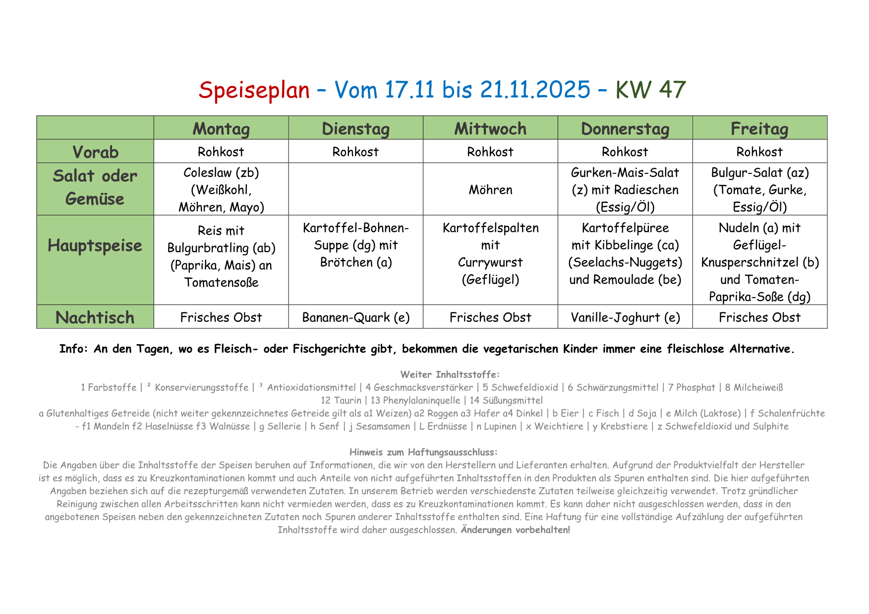 Speiseplan vom 17.11 - 21.11.2025 - 47 KW