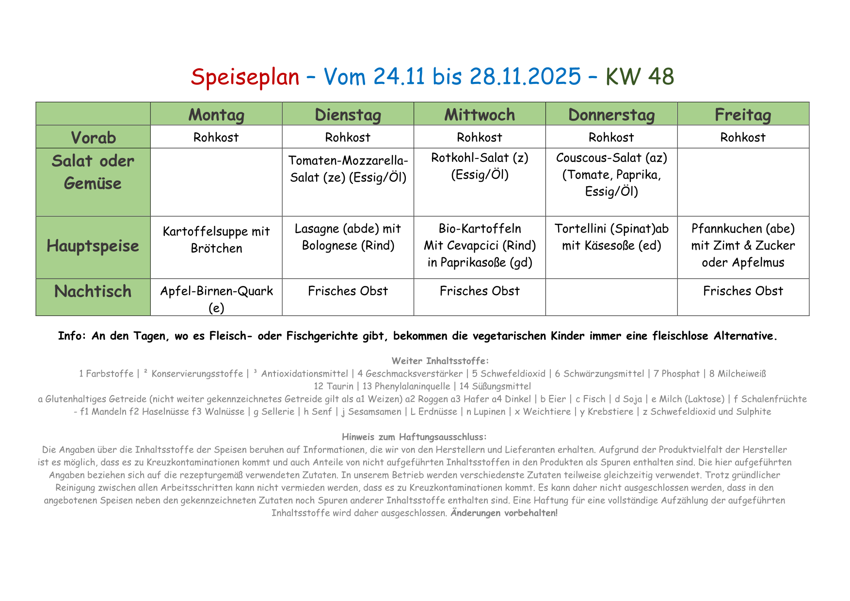 Speiseplan vom 24.11. - 28.11.2025 - 48 KW