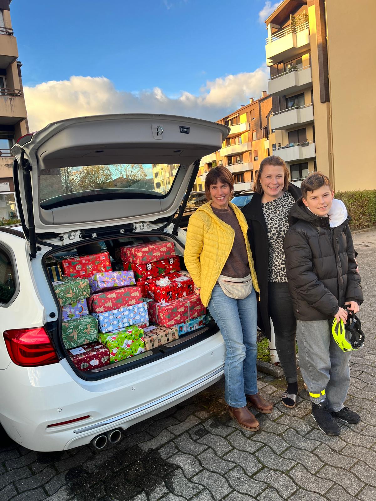Die Eltern und Kinder der Eichendorffschule haben einen ganzen Kofferraum voll mit Geschenken für den Weihnachtspäckchenkonvoi gepackt. Frau Droll (Mitte) hat sie abgeholt und bringt sie zum Verladen zu den LKWs. Für weitere Informationen zu dieser Aktion einfach auf das Foto klicken.